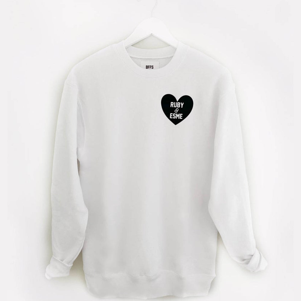 HEART U MOST is a cozy soft fleece pullover sweatshirt, personalized just for you with names of your choice in a stamped vinyl heart. White sweatshirt with vinyl black heart.