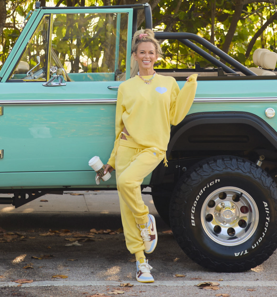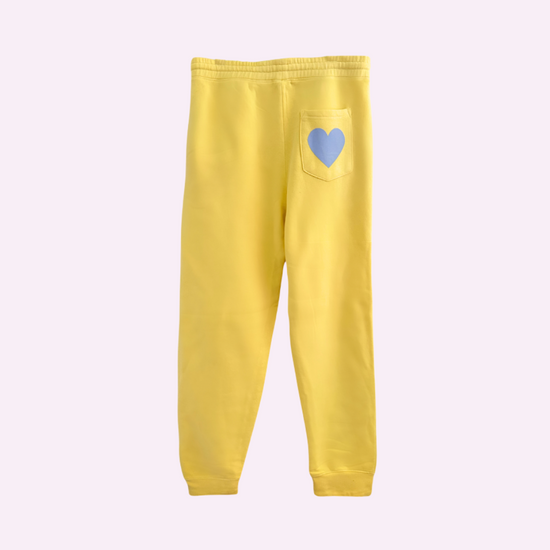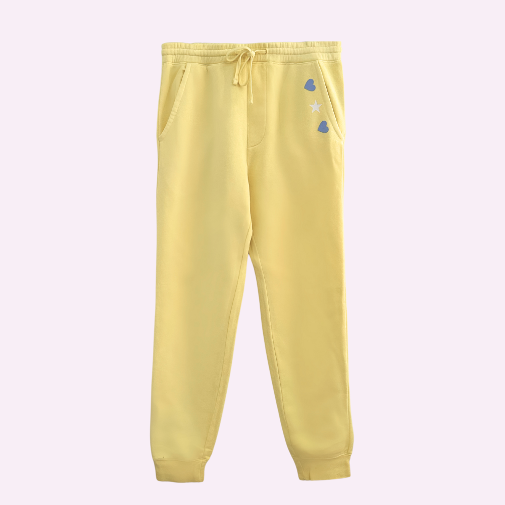 Butter yellow, relaxed fit joggers. Completed with a printed details on front and a blue heart on the back pocket. Make it a set with Jena's favorite hoodie.